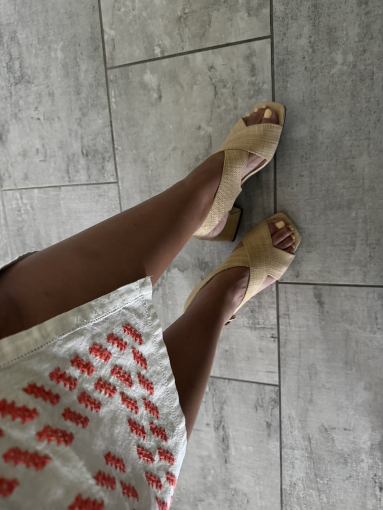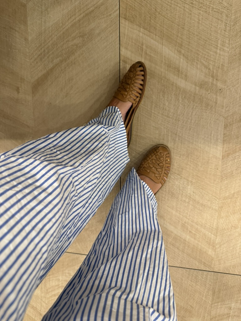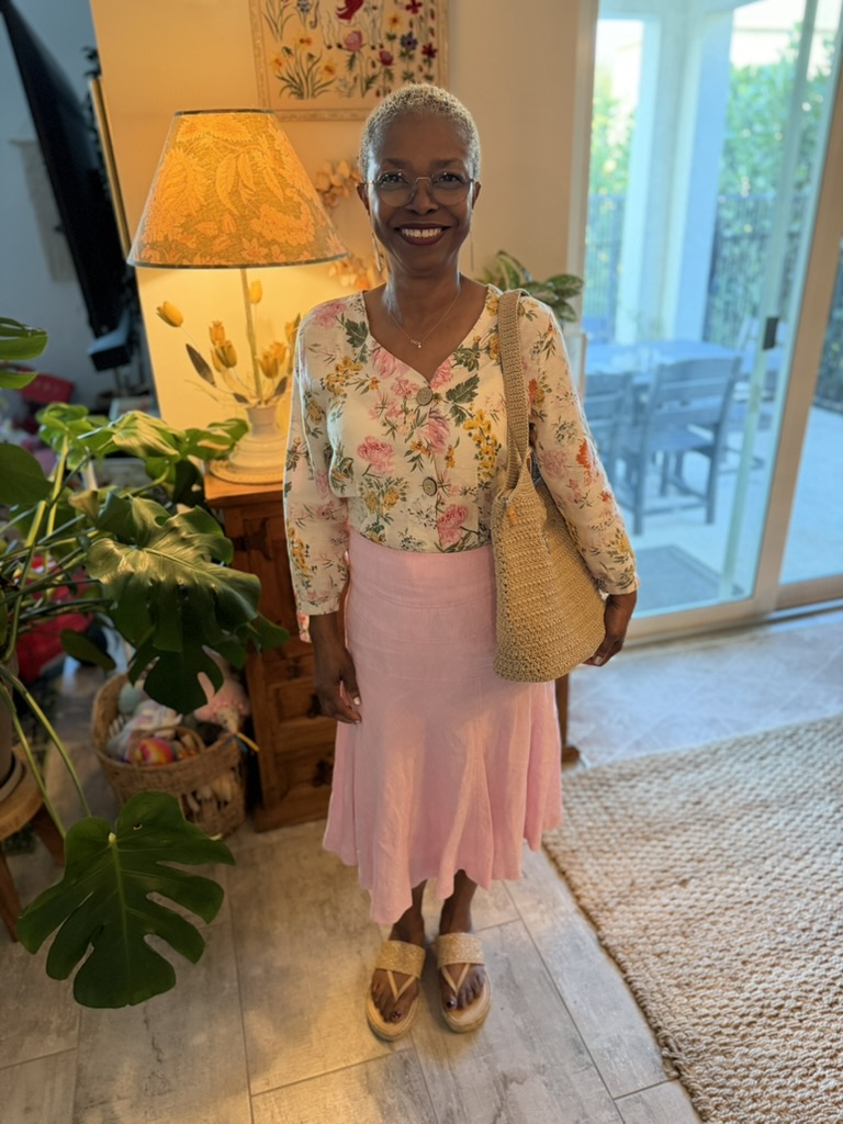 Top from The Nearly New Shop West Palm BeachSandals from Goodwill West Palm BeachButton Up and Linen Pants from Goodwill West Palm BeachMom’s entire outfit is Goodwill West Palm Beach – Top, Skirt, Sandals, and BagTop and Bag from Goodwill West Palm BeachCardigan from my Swap Brunch Party, Pants passed down from a friend, Tote from Goodwill West Palm BeachCole Haan Pumps from Goodwill West Palm Beach