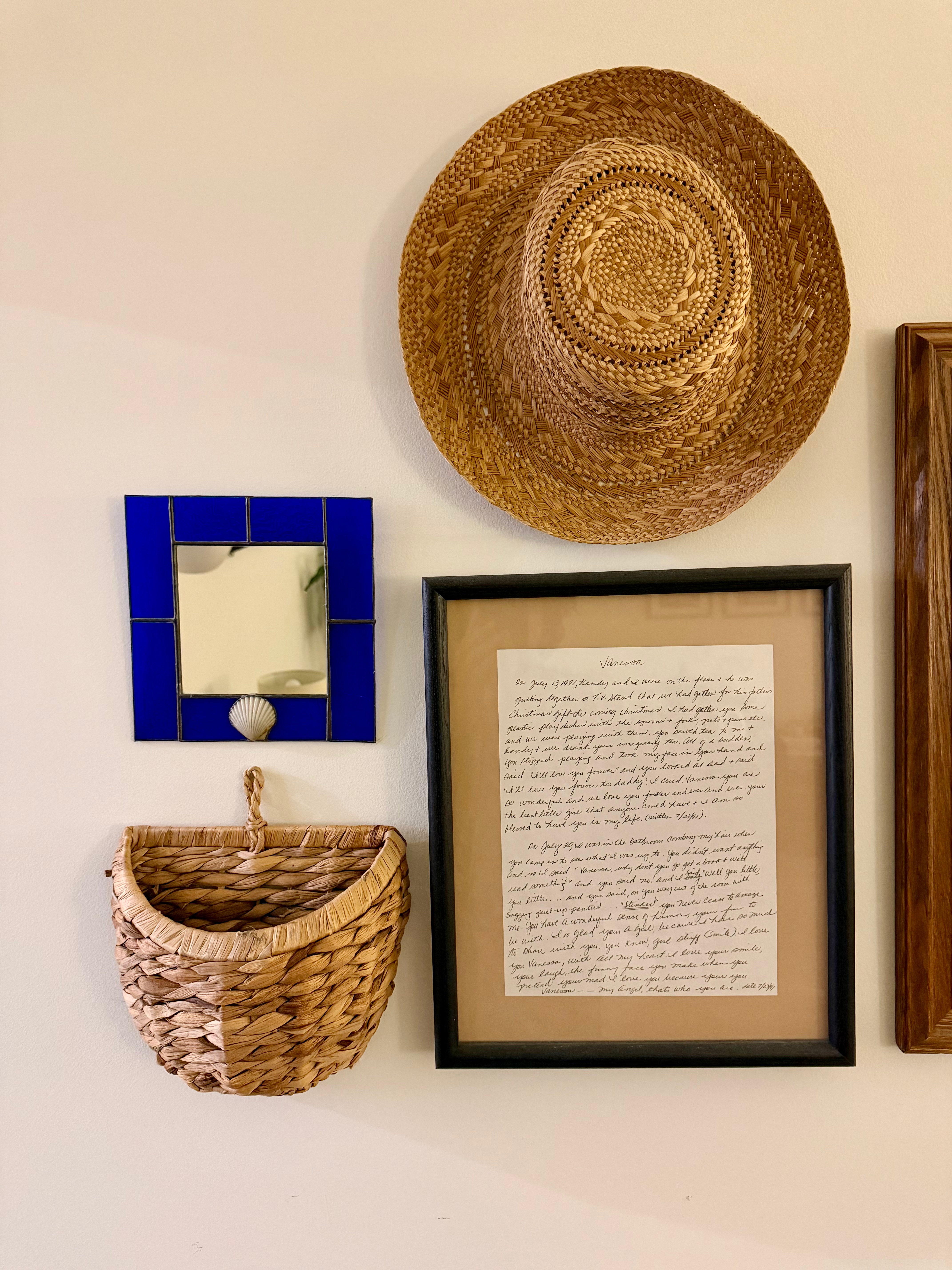 I’ve hung a hat from Stone Button Studio in Northwood Village, a little stained glass and shell mirror purchased at the Northwood Holiday Home Tours market in 2024, a basket I’ve just added to the collection this weekend (purchased at The Rust Market in Lake Park), and my favorite piece of all — framed hand written notes from my mother.