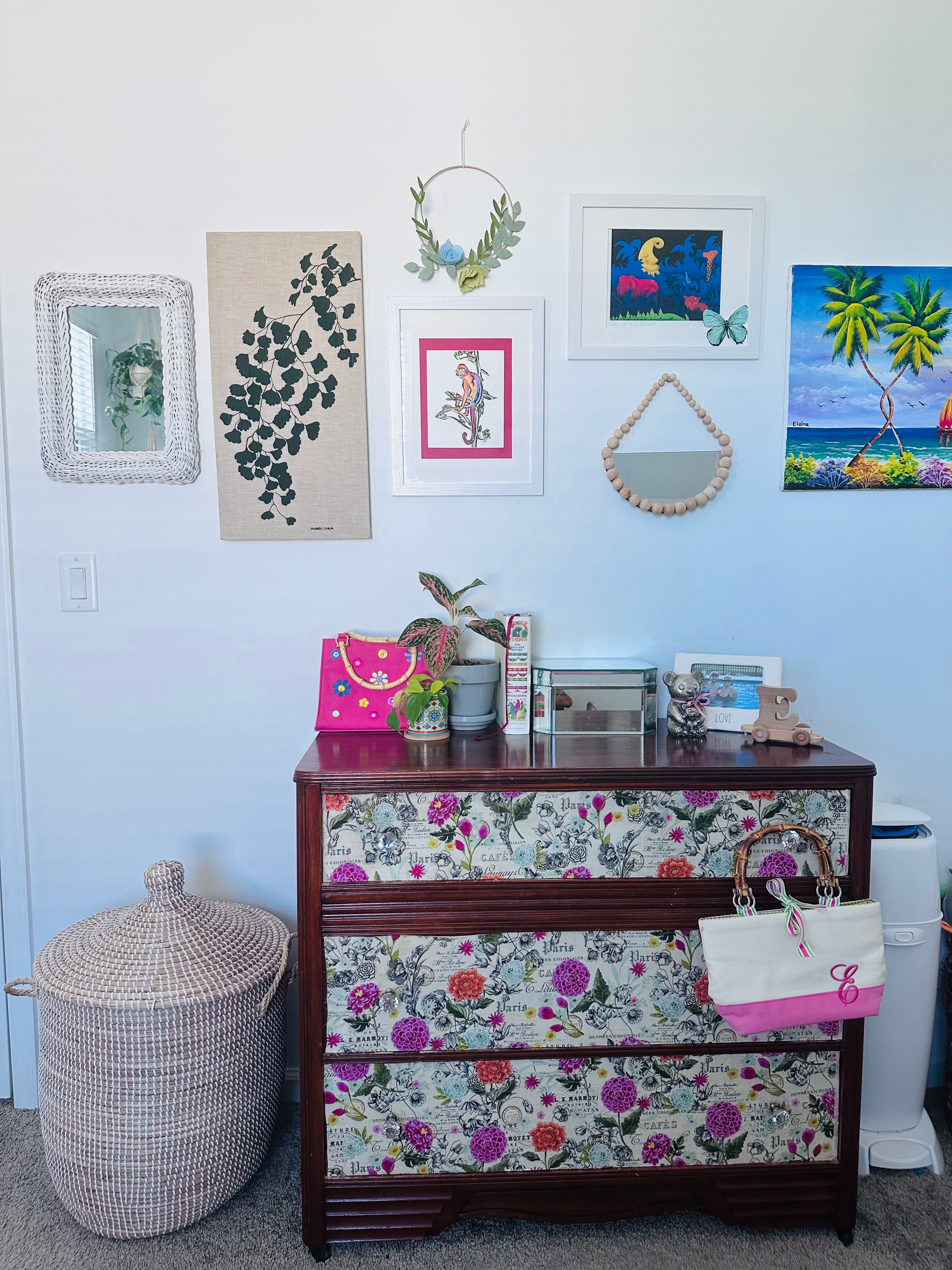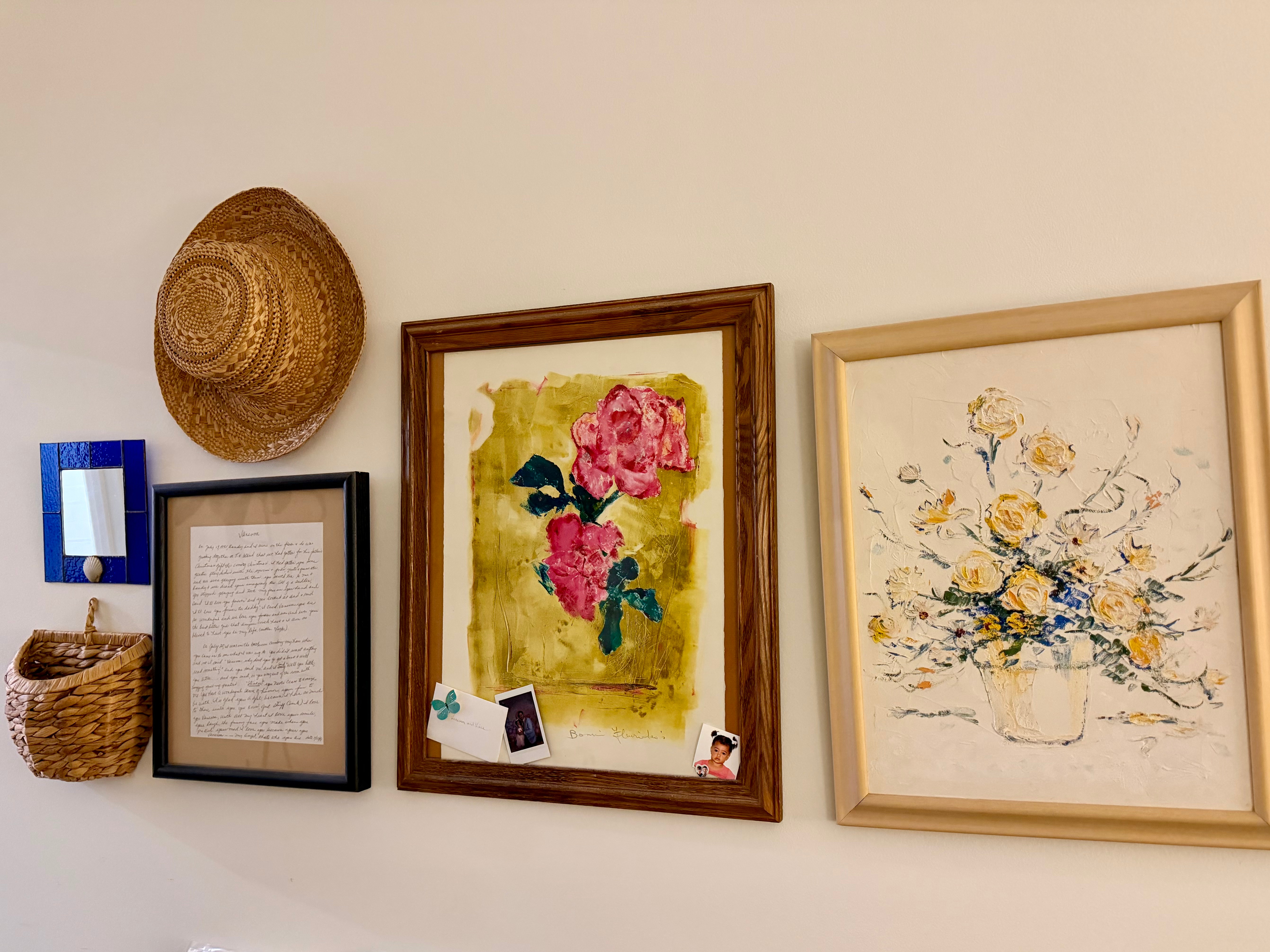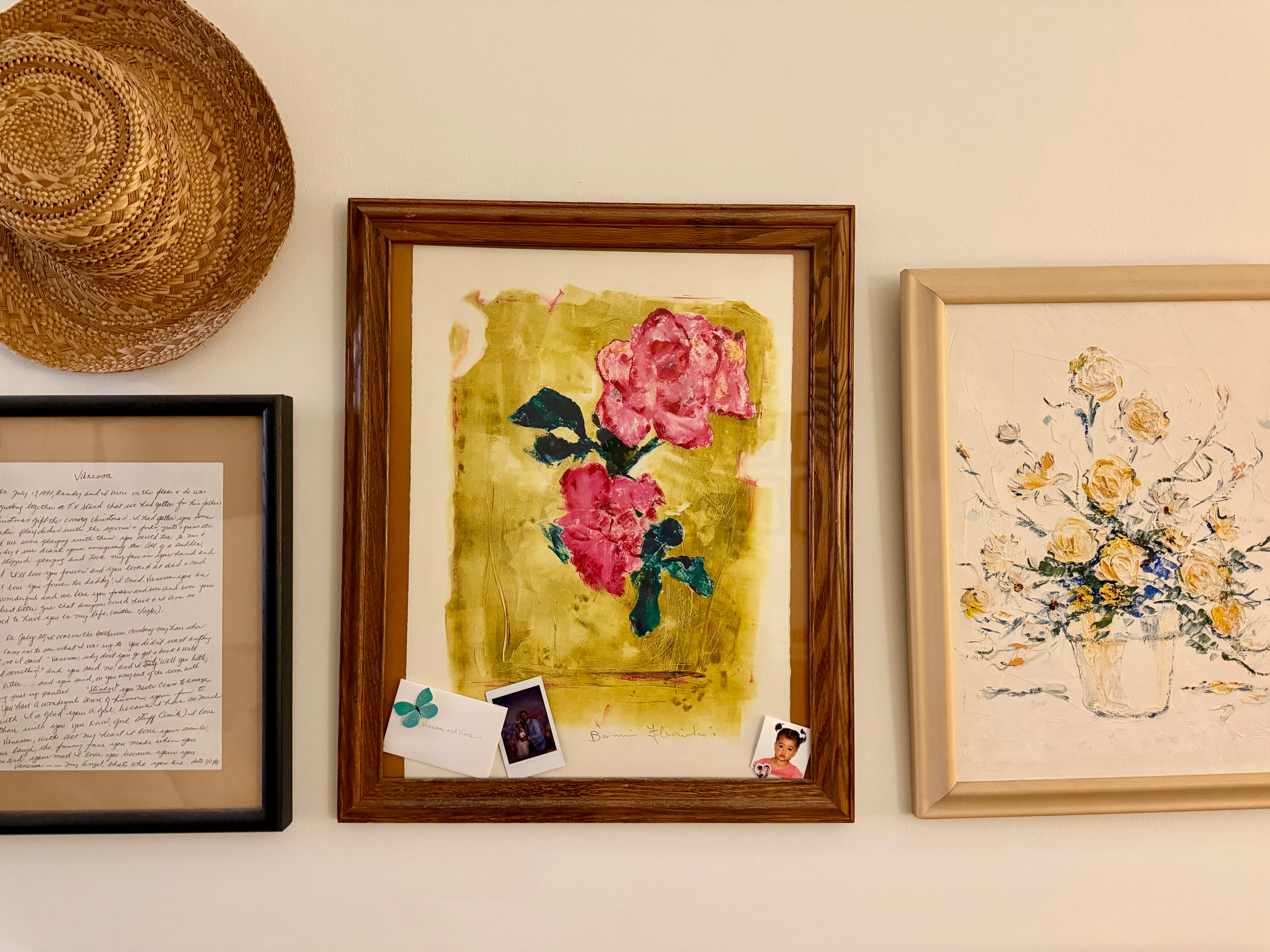 It includes a floral painting found years ago at Stitches and Rust (the owner now operates a shop called Trashé Vintage), and a painting given to me by my mother.