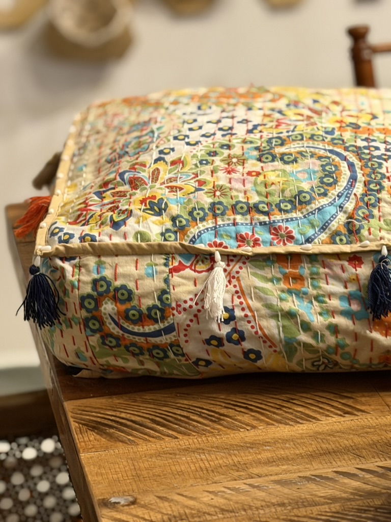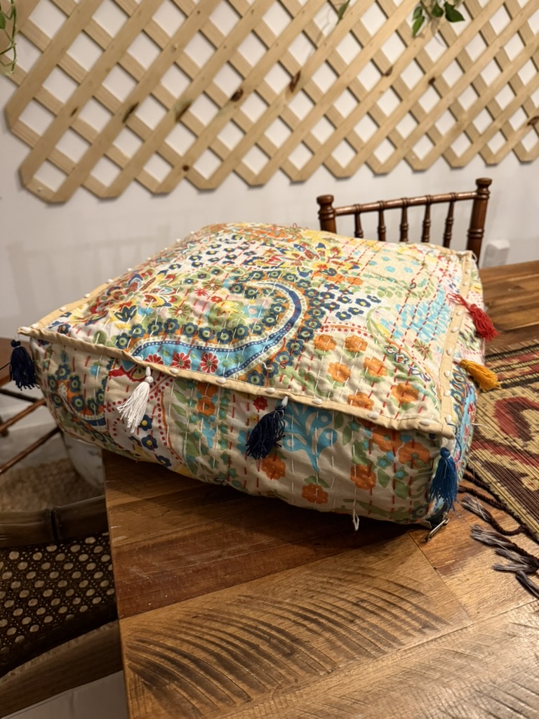 Bag of goodies! Goodies included these wreath earrings (so tempted to wear these all year round) and a little vintage vase pendant. I’m picturing this on a long chain! Love unique finds like this. I also grabbed two pins – I’ve been adding pins to some of my purses, and have been accessorizing sweaters with them this winter.I snagged this awesome pouf for $5!