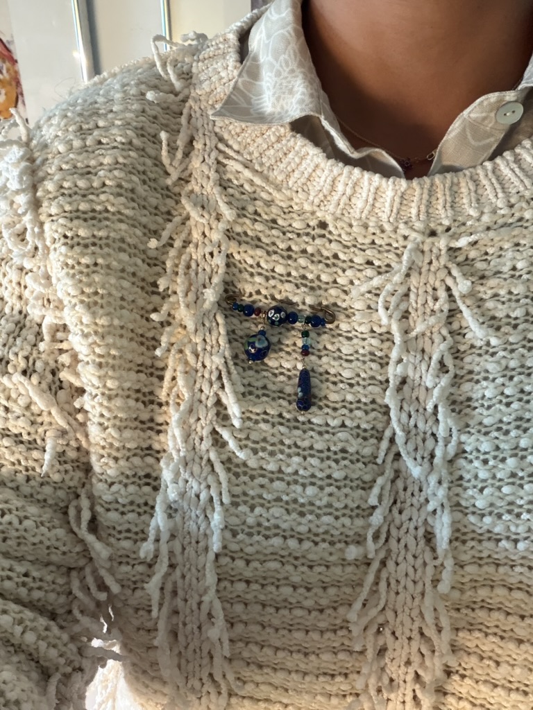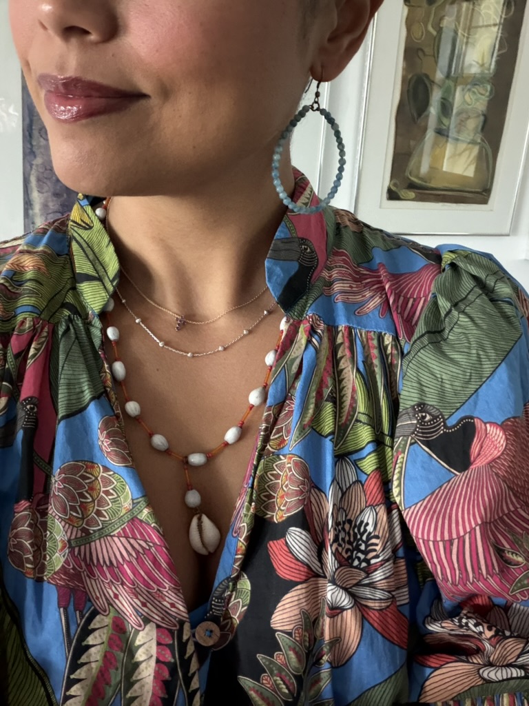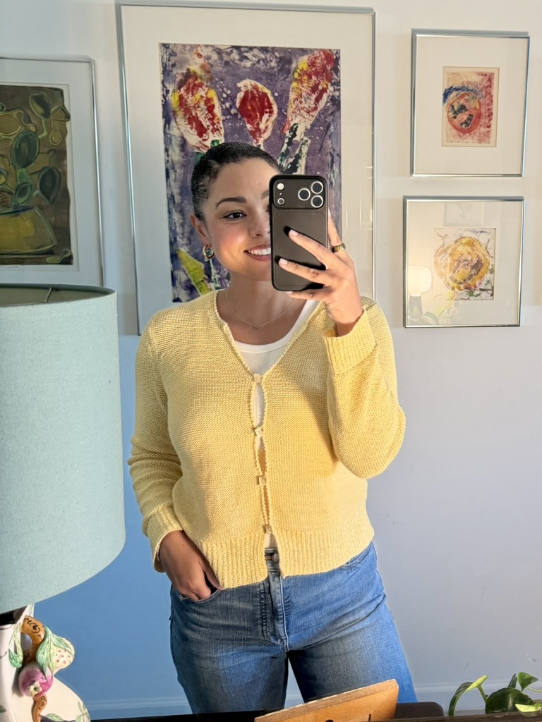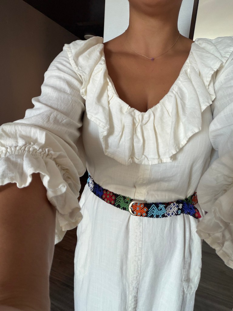 Sweater and MANGO tote from Goodwill West Palm BeachRing from A Timeless Treasure West Palm BeachSweater from Goodwill West Palm Beach; Madewell Jeans from Goodwill Boutique in Boca Raton Hightop chucks from Goodwill West Palm Beach J. Peterman jumpsuit and leather belt from Goodwill West Palm BeachAnthropologie skirt from Goodwill West Palm Beach; Amazing necklace made of vintage fabric, charms, and shells sourced from thrift and estate sale trips made by Sarah Bray BermudaA closer look at my stunning Sarah Bray Bermuda necklace! Baby girl’s dress from Goodwill West Palm BeachMom bought me a pair of tassels from the Rust Market in Lake Park – they are on our end tables in our bedroom for now. This stunning handmade, one-of-a-kind dress made from a hand stitched vintage tablecloth is from a Rust Market vendor named Marcia. She doesn’t sell online/has no digital presence and more people need to know about her!! This dress is one example of many gorgeous designs. I highlighted her in my recent instagram reel – check it out! Vince and I brought a bottle of wine to dinner with friends and I popped on this vintage ornament sourced from a collection I found at Goodwill West Palm Beach.Elaine’s set from Goodwill West Palm Beach