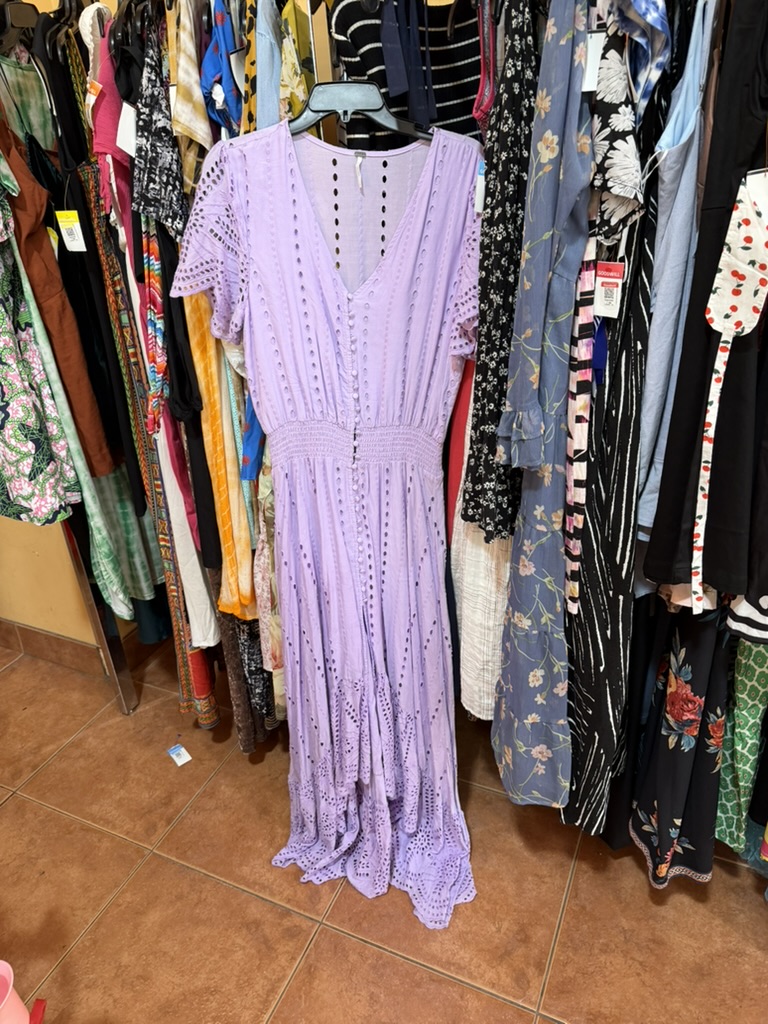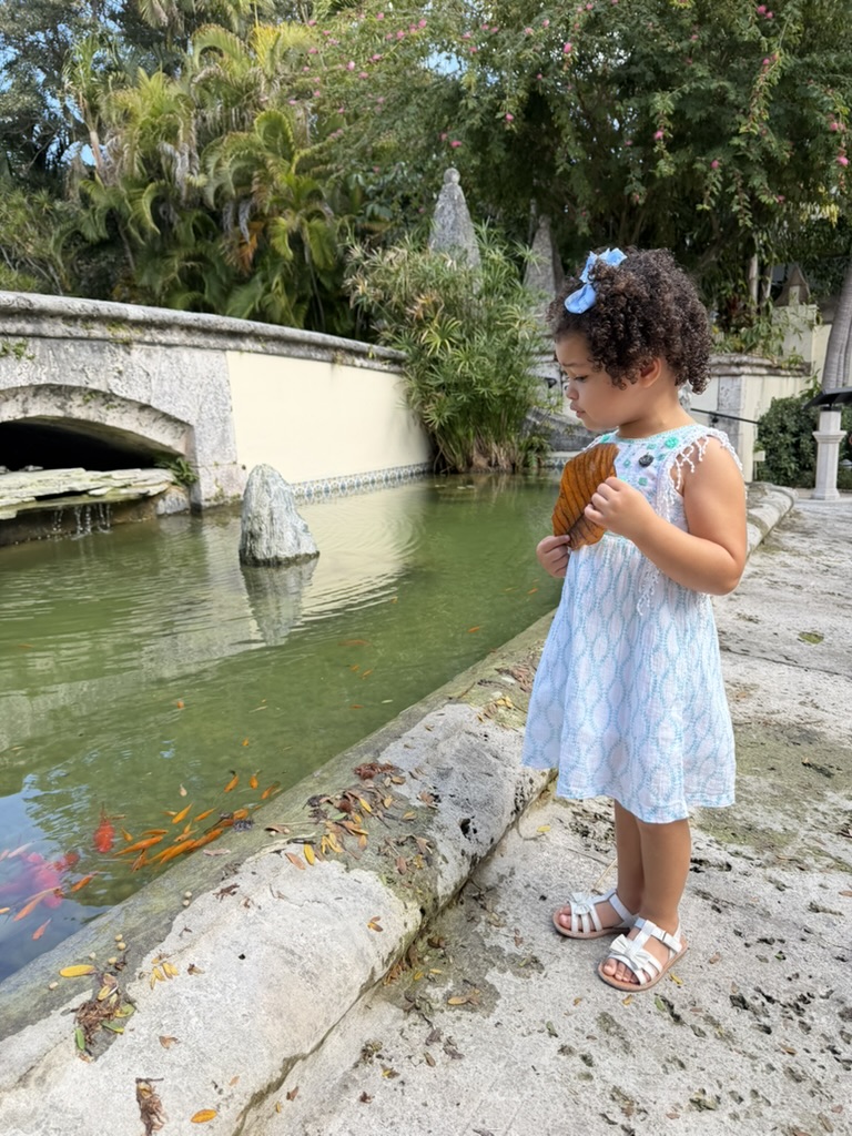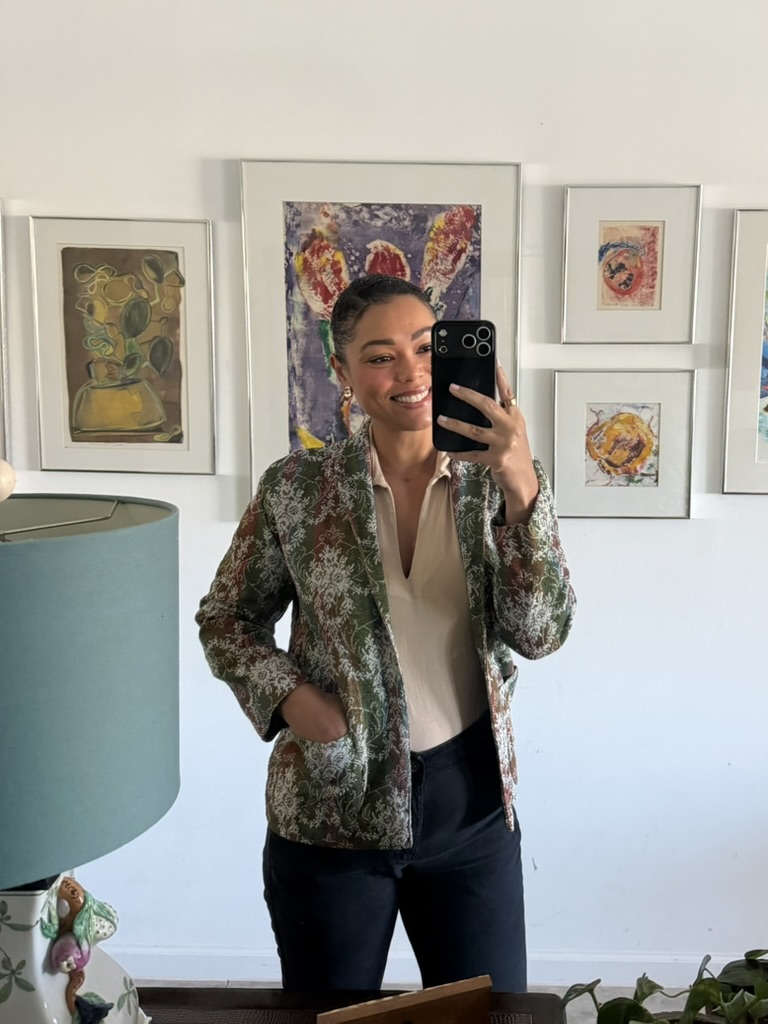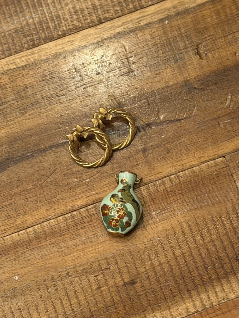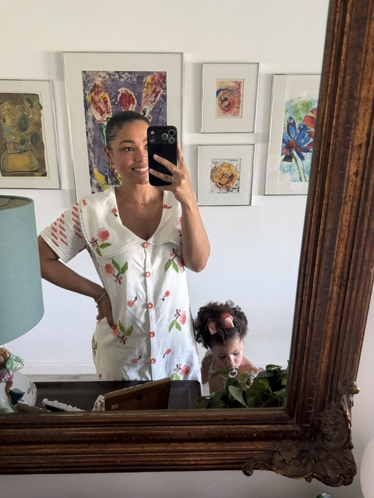 Sweater and MANGO tote from Goodwill West Palm BeachRing from A Timeless Treasure West Palm BeachSweater from Goodwill West Palm Beach; Madewell Jeans from Goodwill Boutique in Boca Raton Hightop chucks from Goodwill West Palm Beach J. Peterman jumpsuit and leather belt from Goodwill West Palm BeachAnthropologie skirt from Goodwill West Palm Beach; Amazing necklace made of vintage fabric, charms, and shells sourced from thrift and estate sale trips made by Sarah Bray BermudaA closer look at my stunning Sarah Bray Bermuda necklace! Baby girl’s dress from Goodwill West Palm BeachMom bought me a pair of tassels from the Rust Market in Lake Park – they are on our end tables in our bedroom for now. This stunning handmade, one-of-a-kind dress made from a hand stitched vintage tablecloth is from a Rust Market vendor named Marcia. She doesn’t sell online/has no digital presence and more people need to know about her!! This dress is one example of many gorgeous designs. I highlighted her in my recent instagram reel – check it out! Vince and I brought a bottle of wine to dinner with friends and I popped on this vintage ornament sourced from a collection I found at Goodwill West Palm Beach.Elaine’s set from Goodwill West Palm Beach