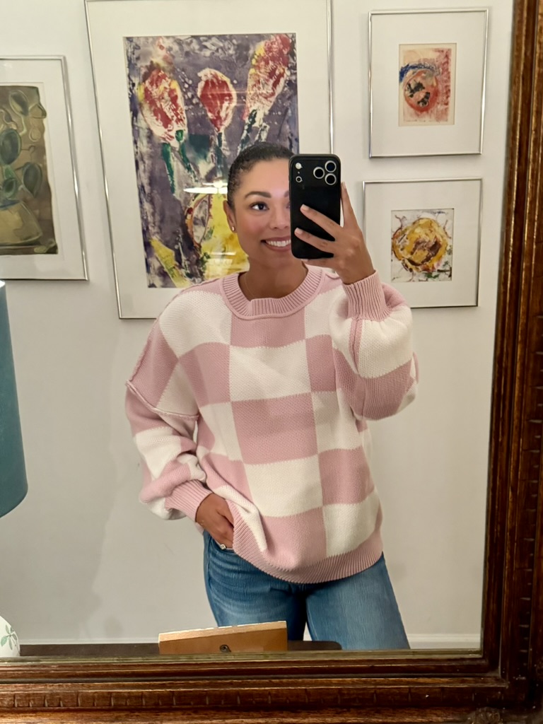 Sweater from Goodwill West Palm Beach; also wearing my new $50 Madewell jeans! Sweatshirt from Goodwill West Palm BeachDress from Goodwill West Palm BeachSweater from Goodwill West Palm BeachExpress shirt and vintage jacket from Goodwill West Palm BeachMom found a pair of chucks – a nostalgic purchase! When she got her first job at 14 she saved up to buy a pair.Mom in a gorgeous dress found at Goodwill West Palm Beach