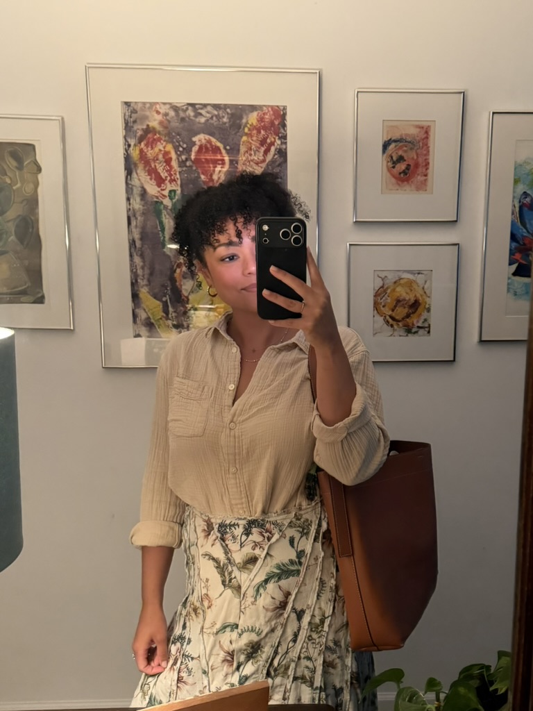 Sweater thrifted and gifted from a friendButton up and striped H&M pants from Goodwill West Palm BeachHuarache sandals from Goodwill West Palm BeachAnthropologie skirt and MANGO tote from Goodwill West Palm BeachSunshine State cap from Goodwill West Palm BeachHandmade dress created from a thrifted, vintage tablecloth purchased from a designer who exclusively sells at The Rust Market in Lake ParkJ. McLaughlin sandals from Goodwill West Palm BeachMen’s striped button up from Goodwill Denver, CO