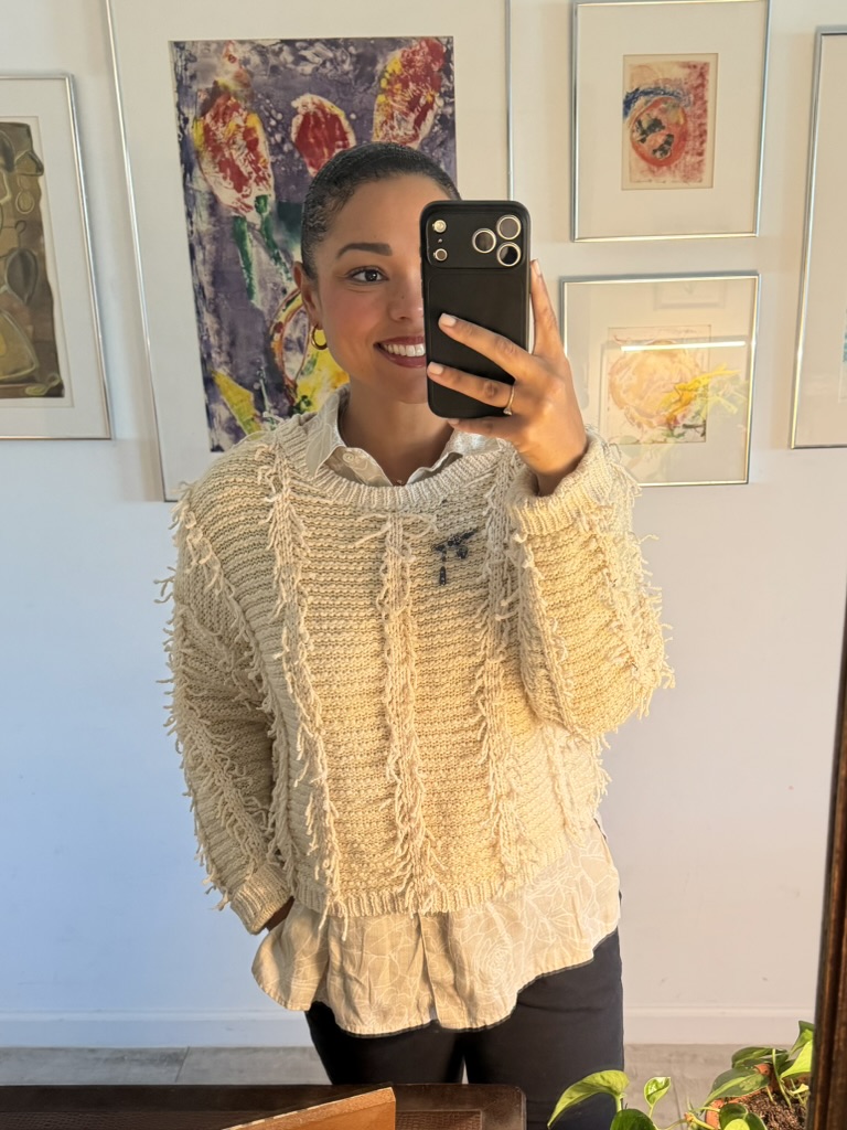 J.Crew sweater from Goodwill West Palm BeachNo tag sweater from Goodwill West Palm BeachNike windbreaker from Goodwill West Palm BeachSweater from Goodwill West Palm Beach, J.Jill linen button up from Goodwill Denver, Pin from Trashe Vintage’s Rummage SaleLinnette bag from Goodwill West Palm BeachClose up of this lil cutie pinTreasure and Bond Boots from Goodwill West Palm Beach