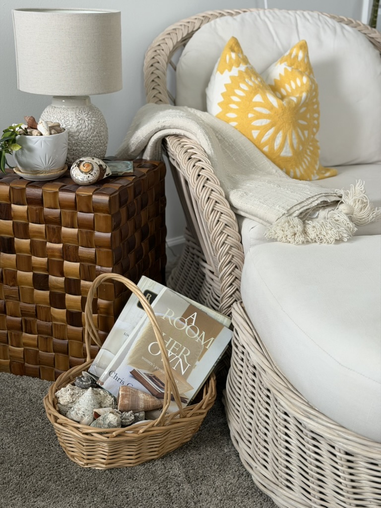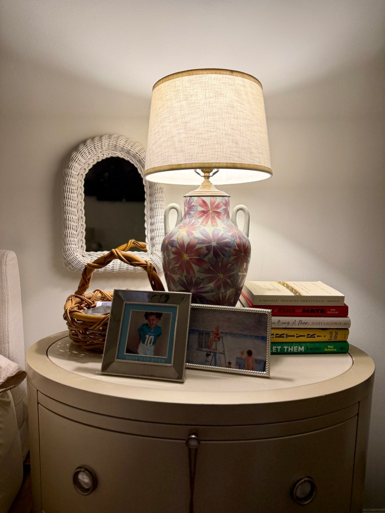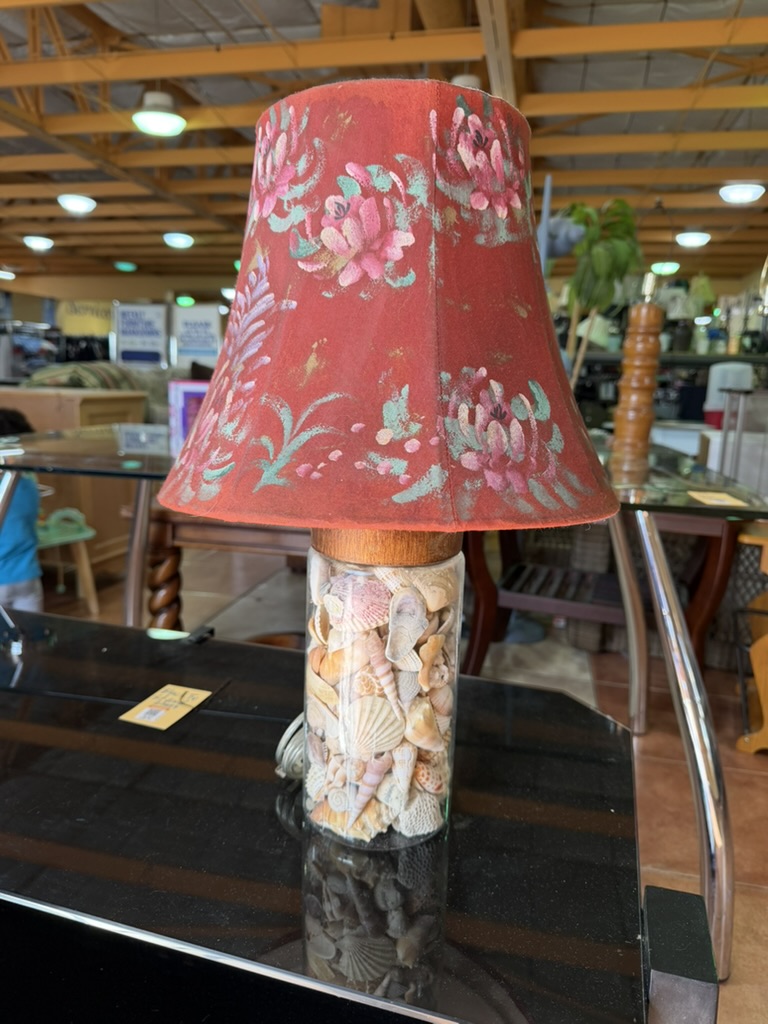 Picture a palm leaf sticking out of this — so coastal chic! This shell lamp base had a different shade on top, but I found this other hand painted one and thought they looked cool together. I’m currently lamp rich, though, so had to leave this behind!