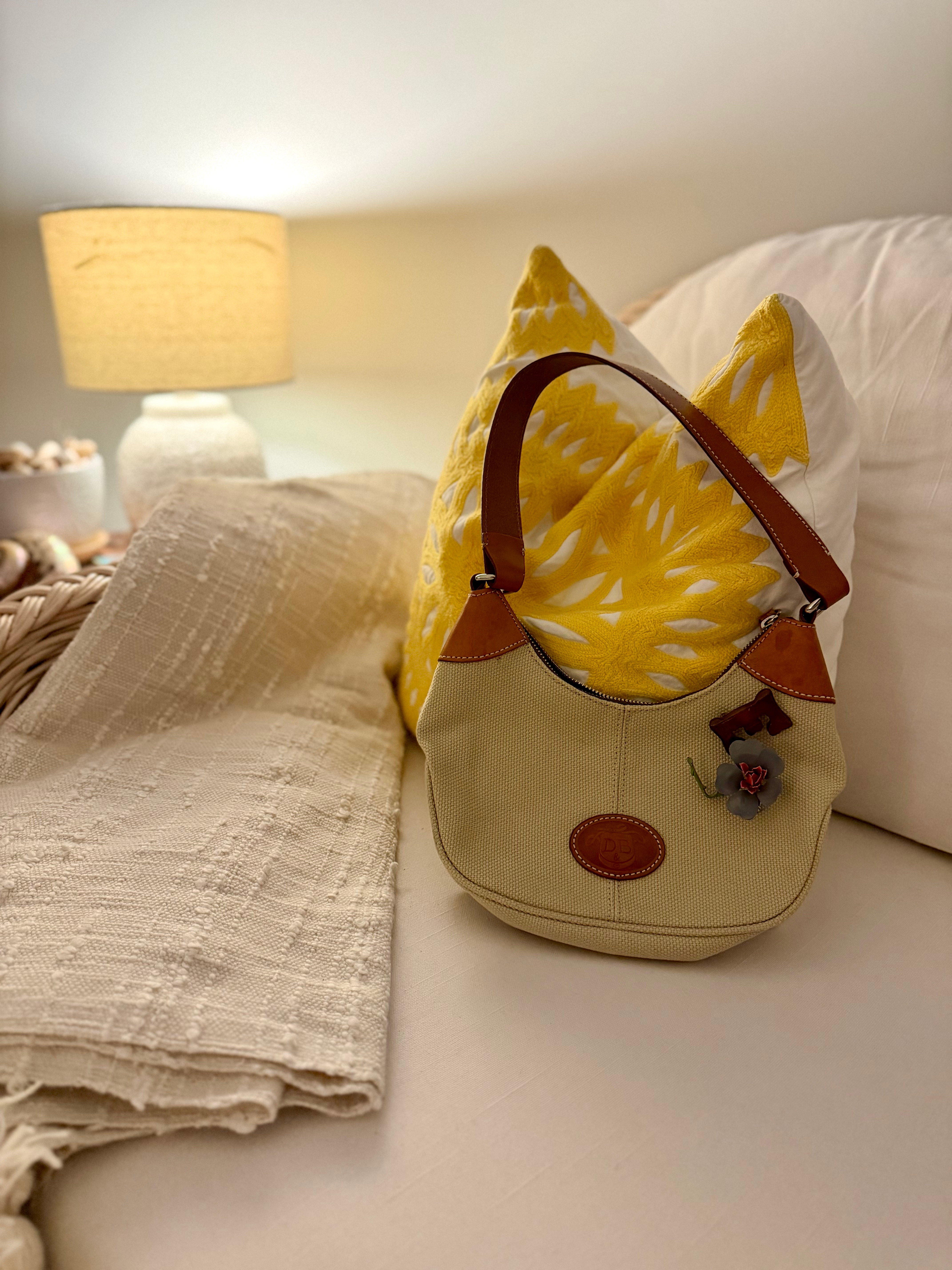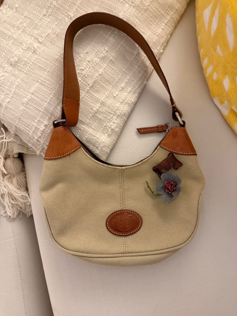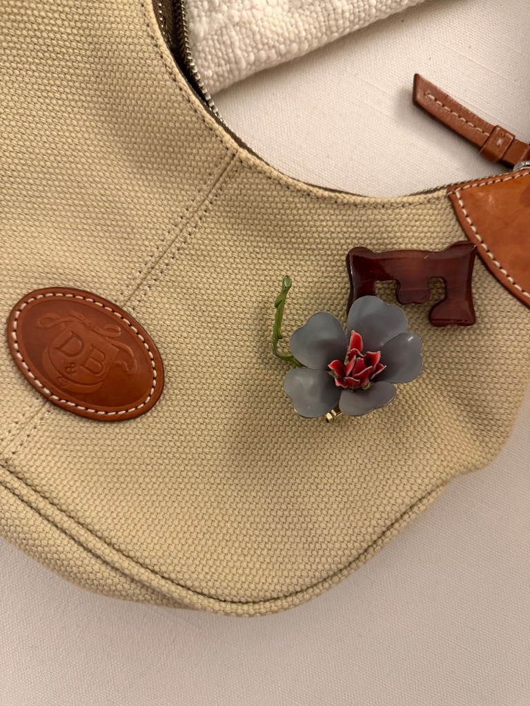 I thrifted this old Dooney & Bourke canvas purse from Goodwill years ago, and have given it new life by sticking vintage pins on it that I’ve found while thrifting.