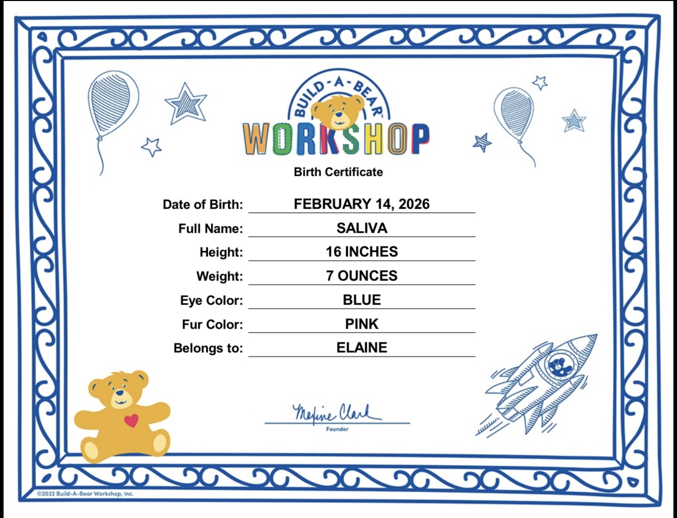 While filling out the bear’s birth certificate, we asked Elaine what to name it and she quickly yelled, “SALIVA!”