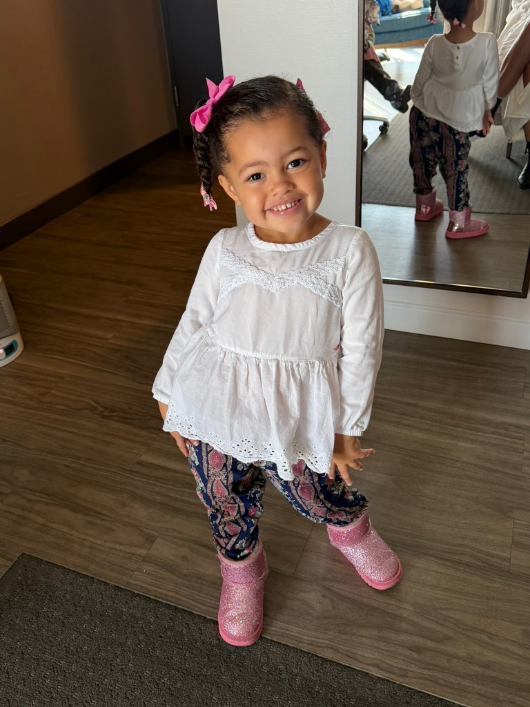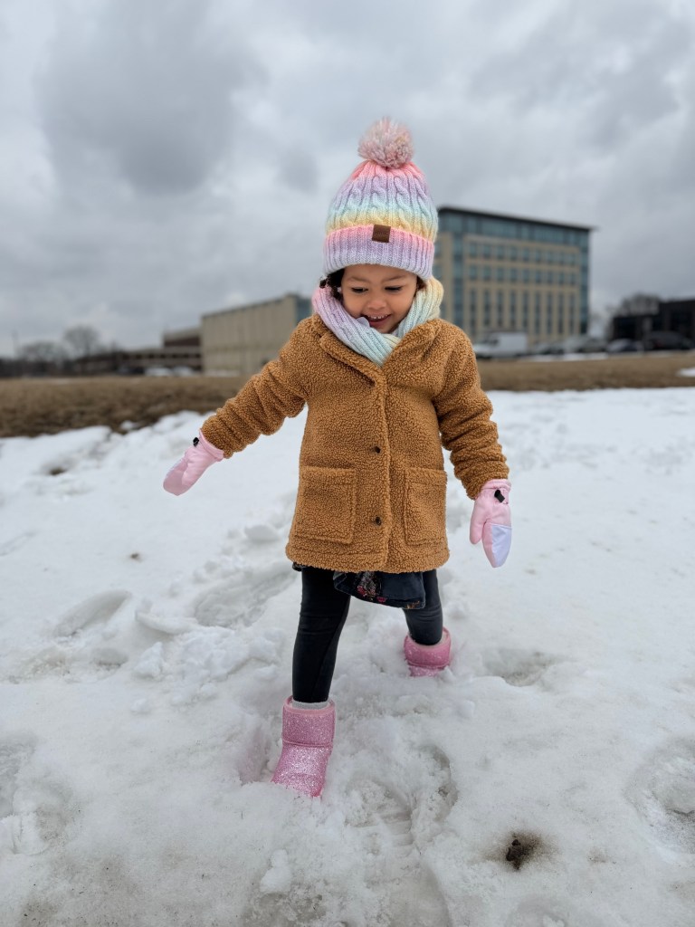Red cardigan and boots from Goodwill West Palm BeachBeaded belt and boots from Goodwill West Palm BeachCloser look at the beaded belt detail; the dress ins’t thrifted, it’s Anthropologie!Baby’s pants are thrifted from Goodwill West Palm Beach and her top is thrifted and gifted from a friendH&M Sweater, GAP jeans, and boots from Goodwill West Palm BeachSeeing snow for the first time! Baby’s coat is consigned from Kid to Kid in Palm Beach Gardens.Sweater from Goodwill West Palm Beach