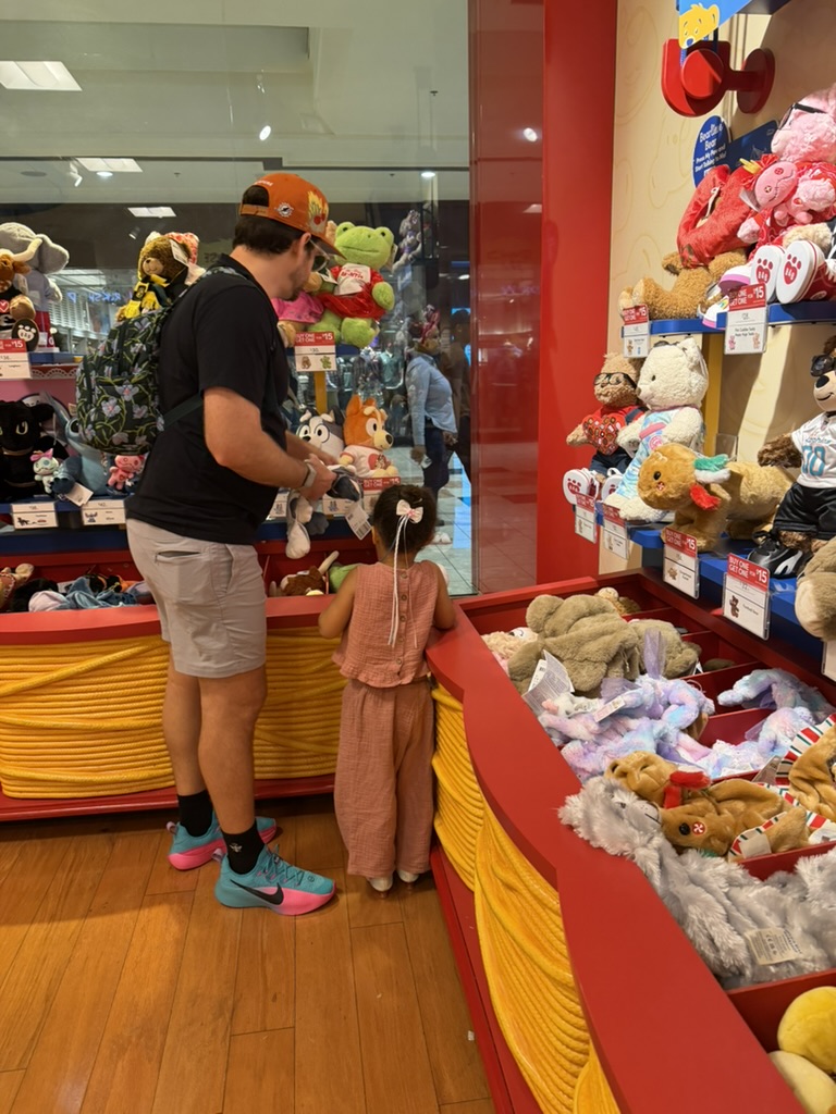 We took her to the mall to pick out a new Build-A-Bear stuffie (her first Build-A-Bear is a red monkey — when you squeeze its hand, Vince’s voice says, “Happy first Valentine’s Day Elaine, I love you!”).