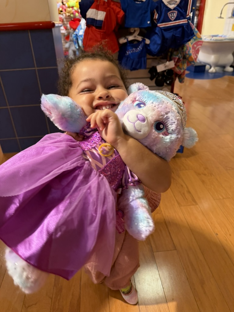 Baby E chose a beautiful, sparkly fairy bear and dressed her in a Rapunzel dress and tiara.