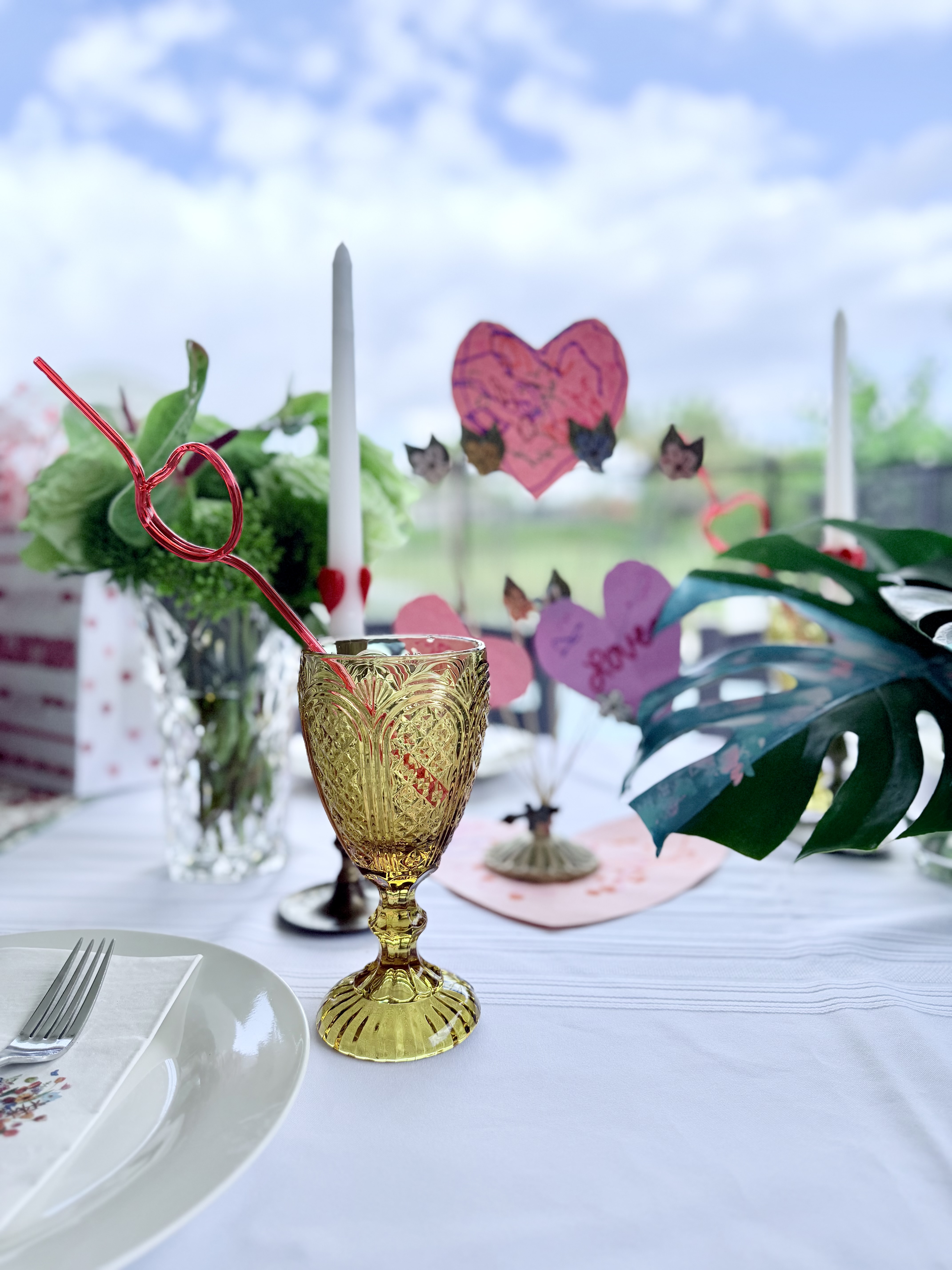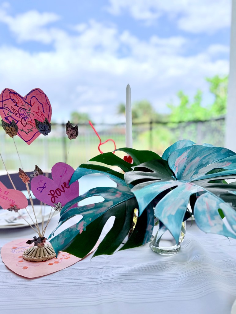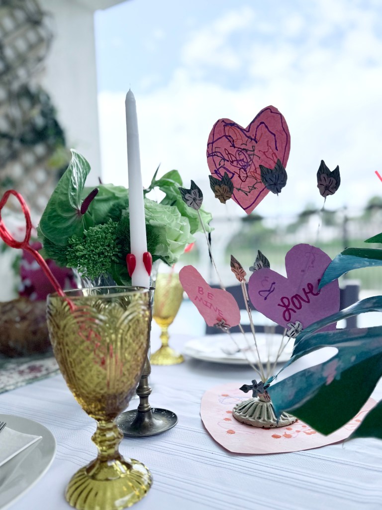 Earlier in the week, Elaine and I decorated construction paper hearts, which we stuck into a fun floral photo holder thingy I thrifted from Goodwill, and that served as our centerpiece.