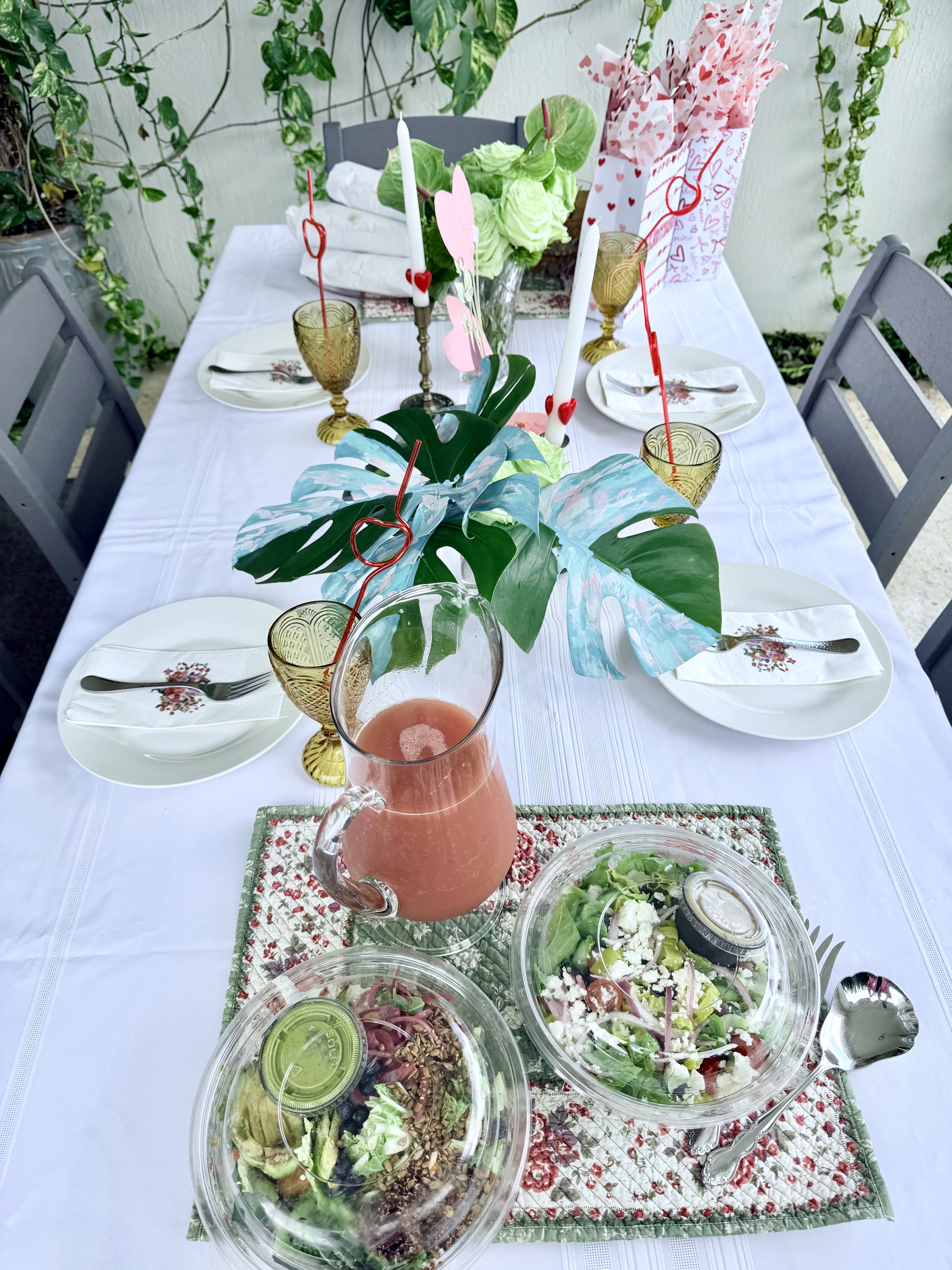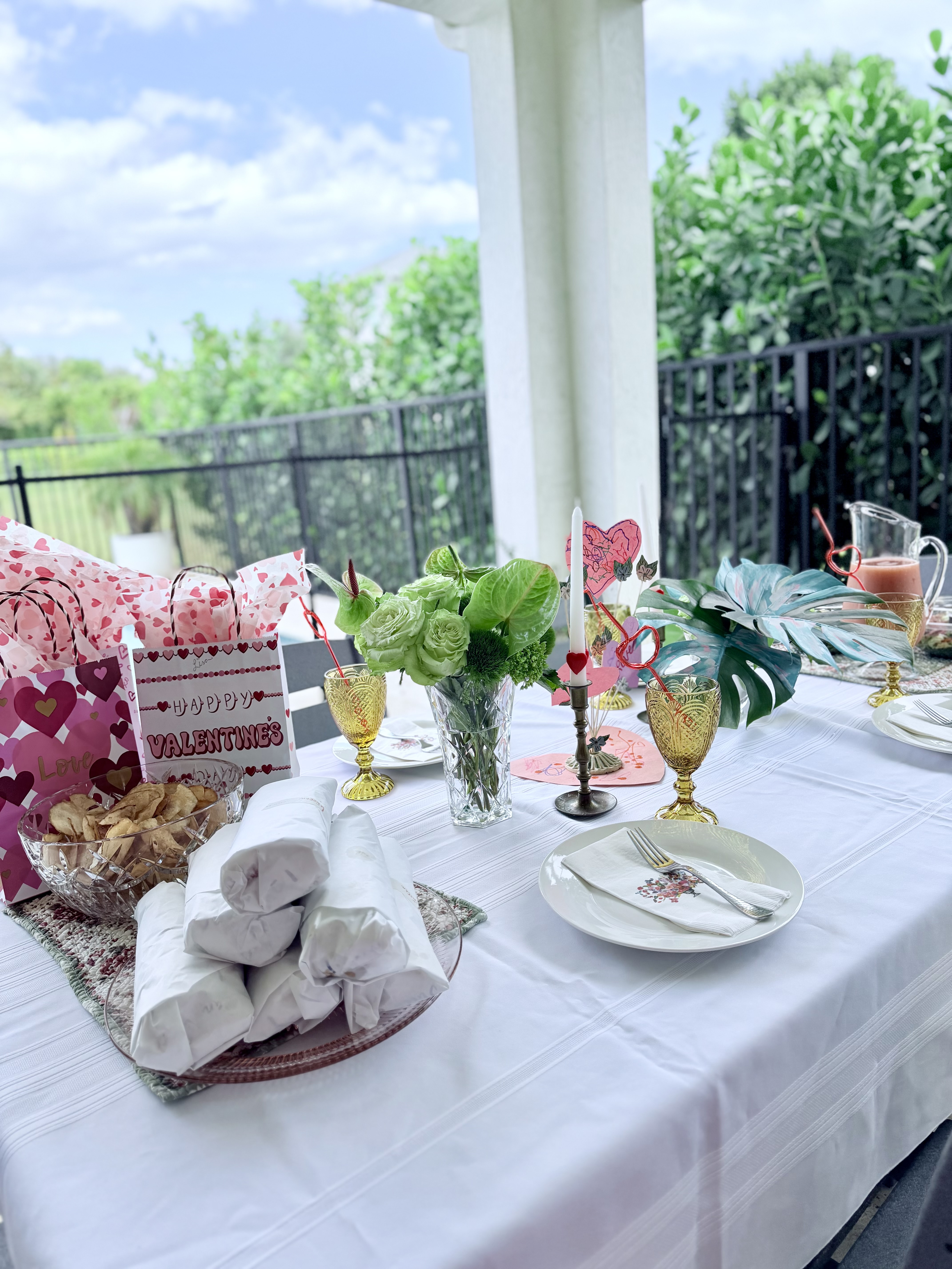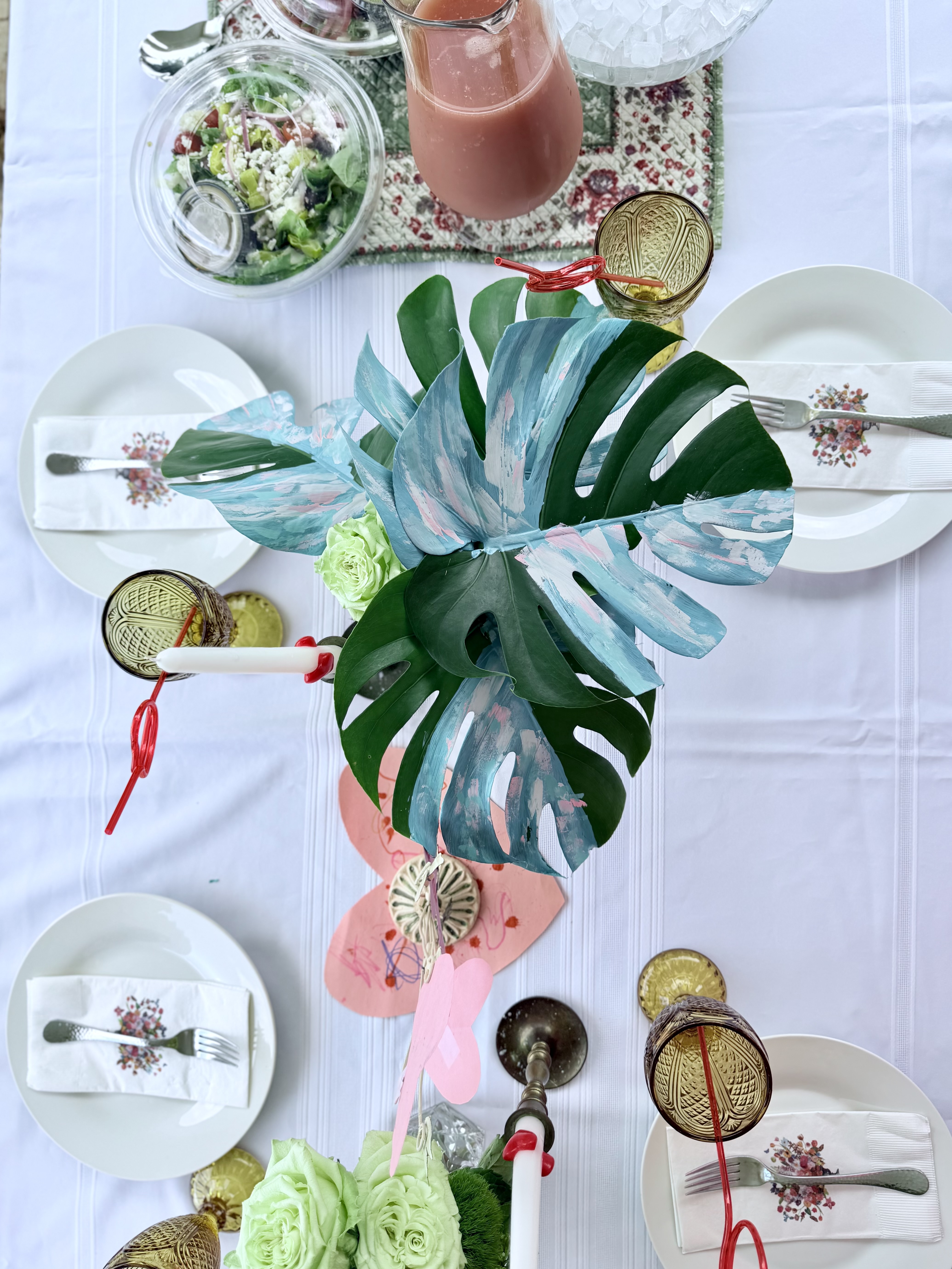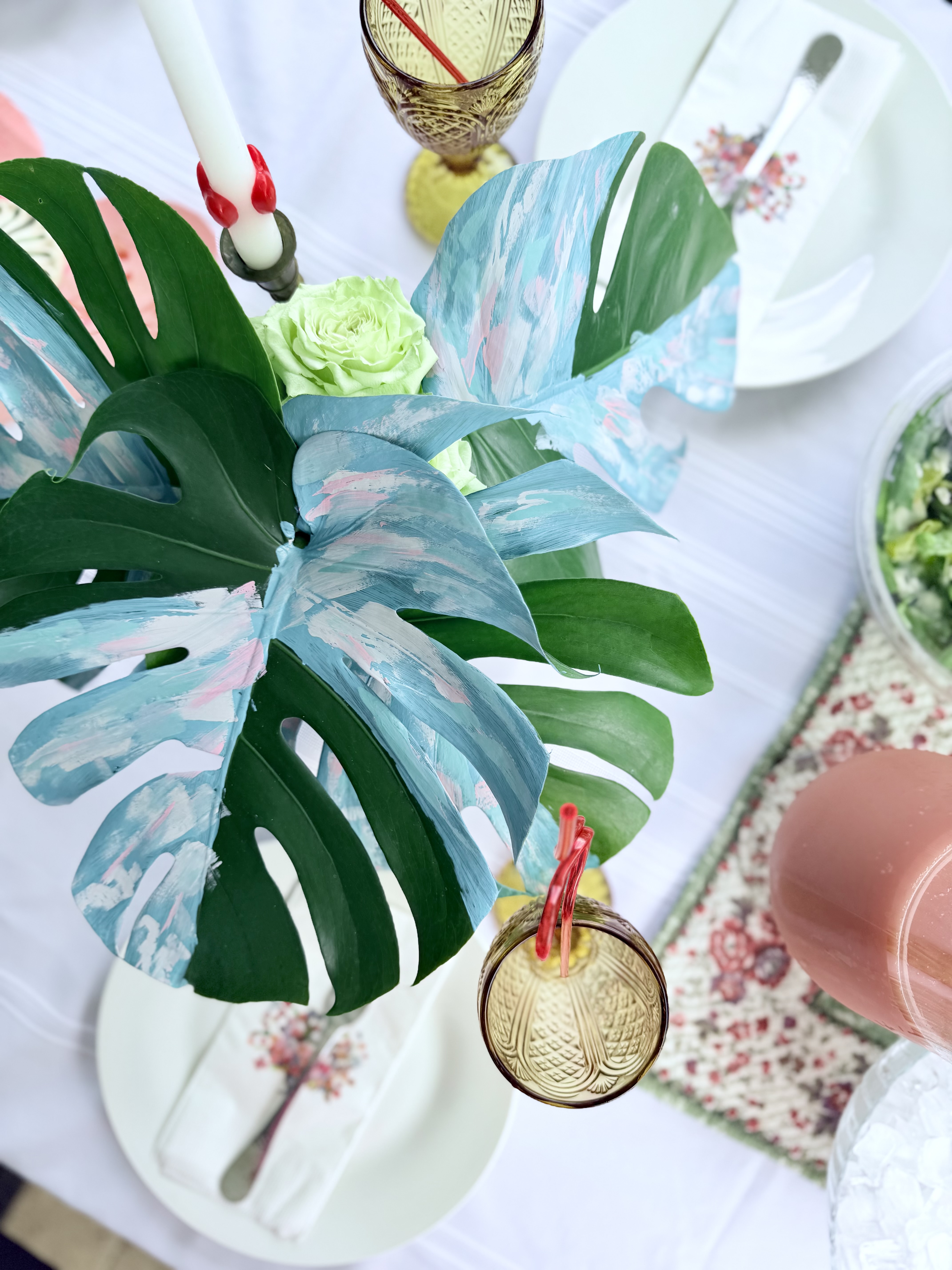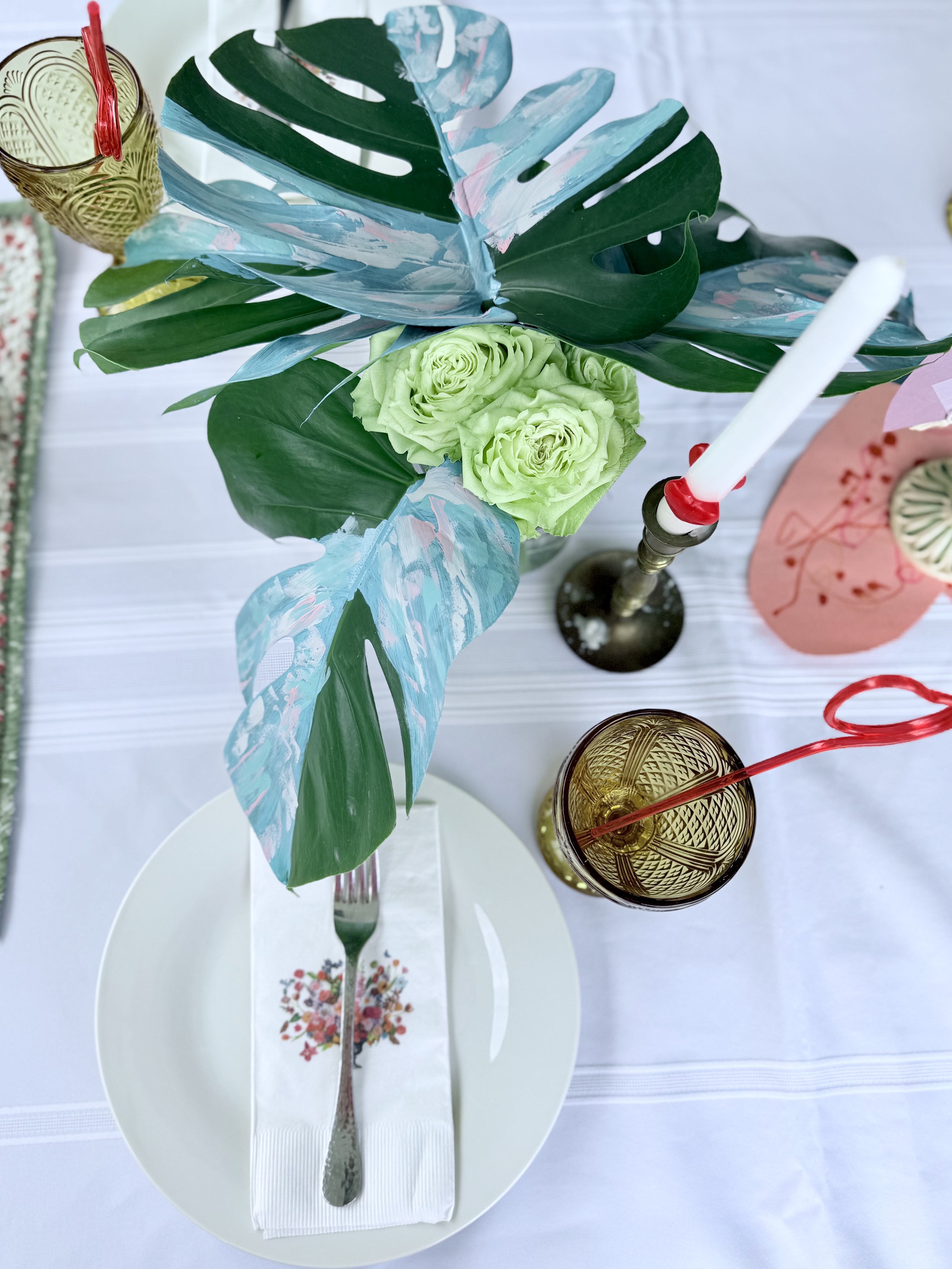 The painted leaves are so cool, right? I stuck the roses and greenery in a crystal vase that was thrifted and gifted from my mother-in-law. She also gifted the pink serving platter I used for the sandwiches and the white tablecloth.