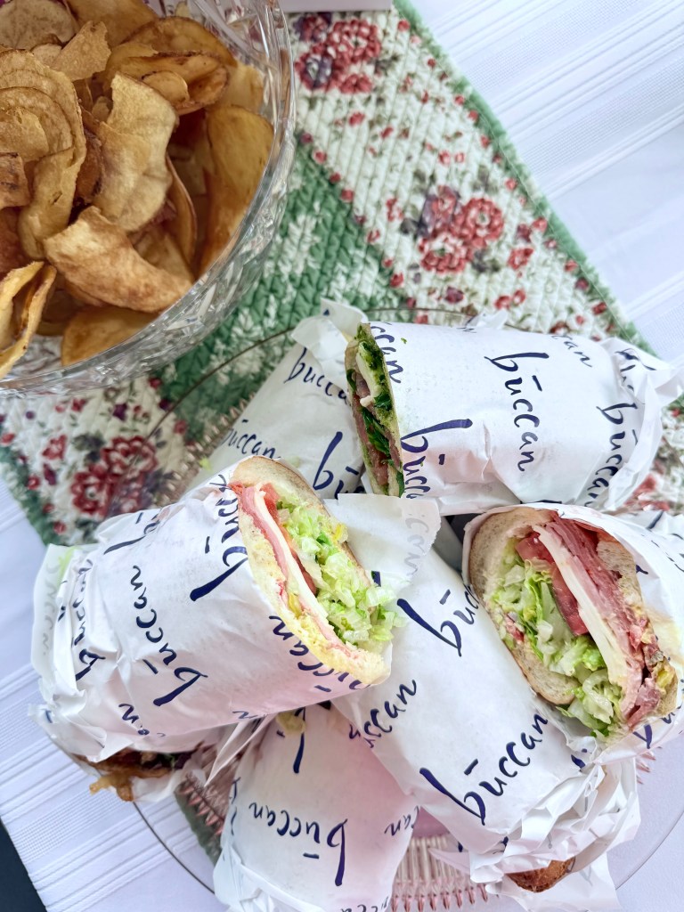 The weather was perfect, so we sat on our back patio for a lunch made of Buccan sandwiches, chips, and salads — all mouthwatering and highly recommended.