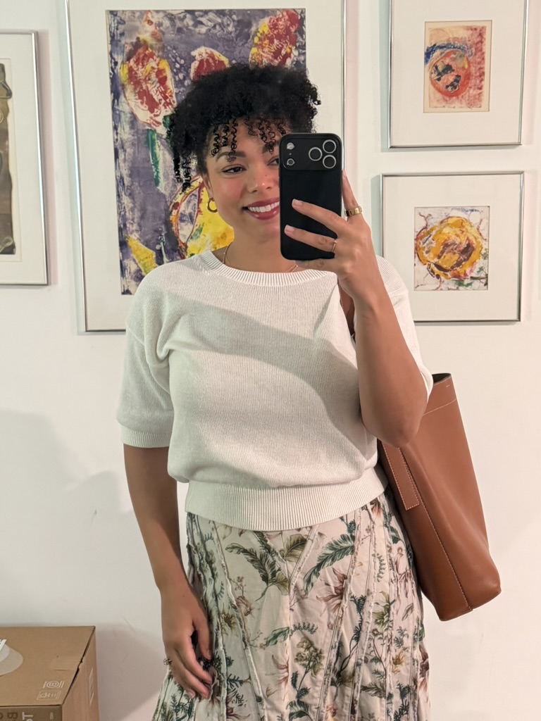 GAP Sweater, Anthropologie Skirt, and MANGO Tote from Goodwill West Palm Beach