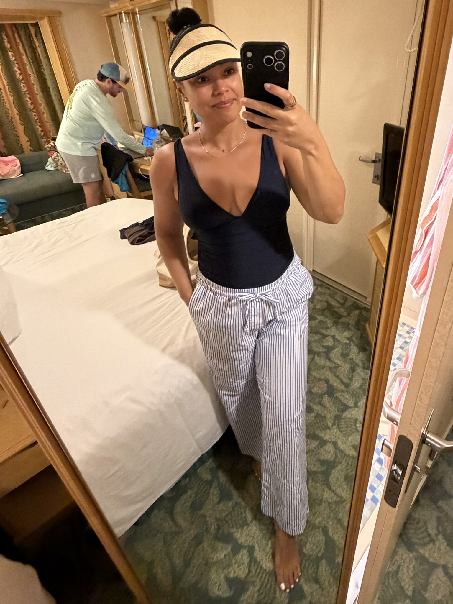 Repurposed my Night One pants for Day Three Pool Day, J.Crew swimsuit is secondhand