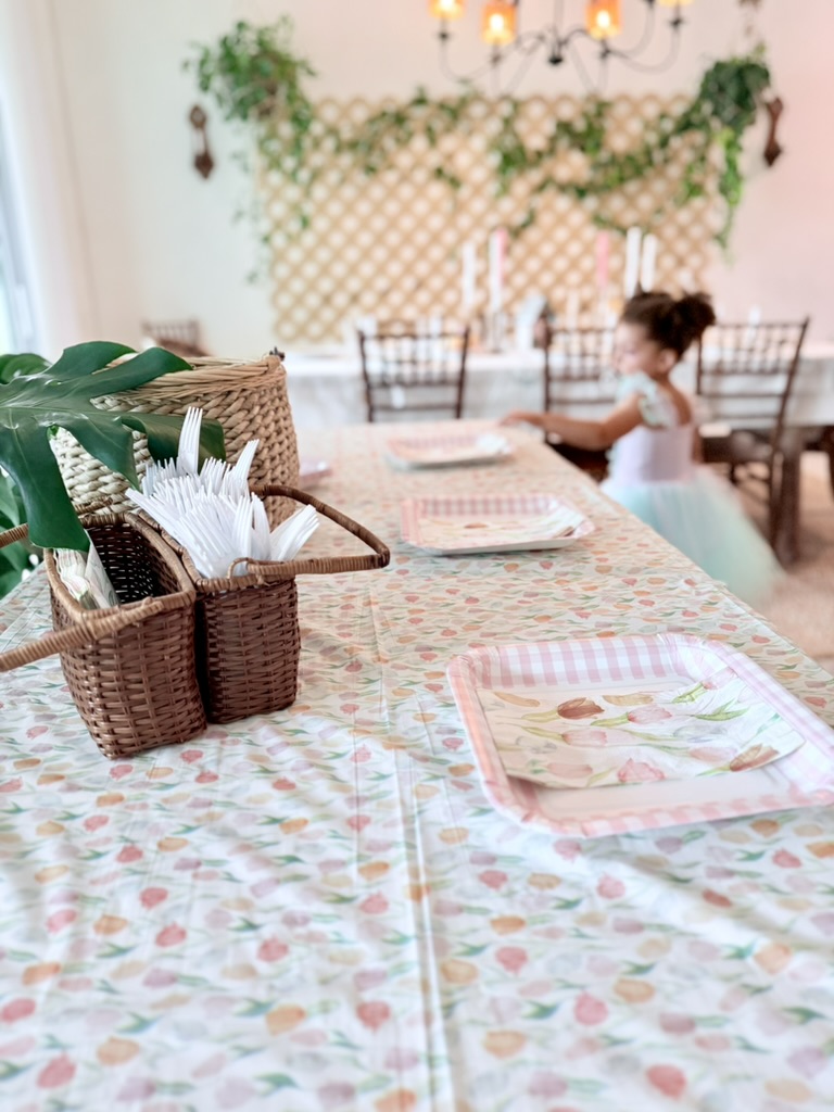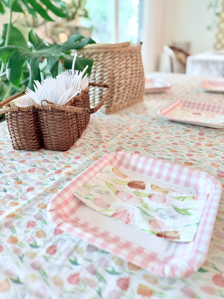 I snagged a tulip print tablecloth, matching paper napkins, and paper plates with a pink gingham pattern for the kiddos.