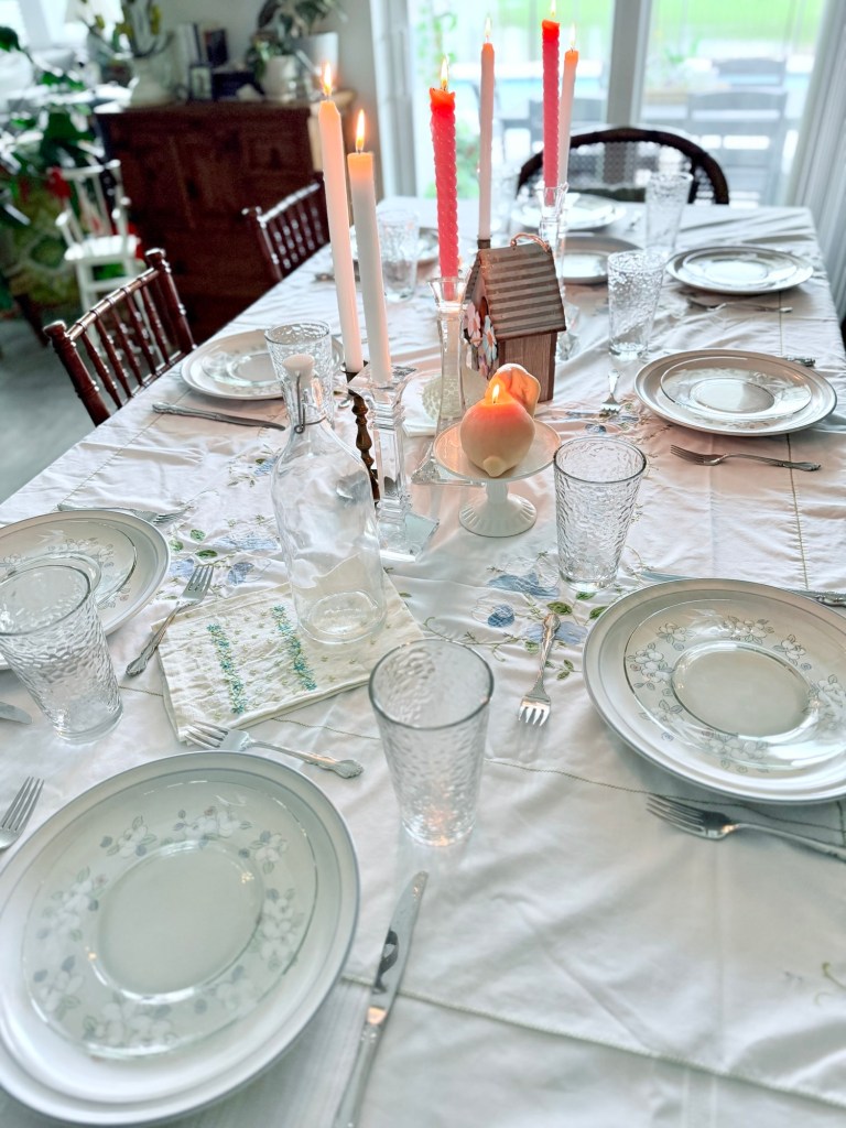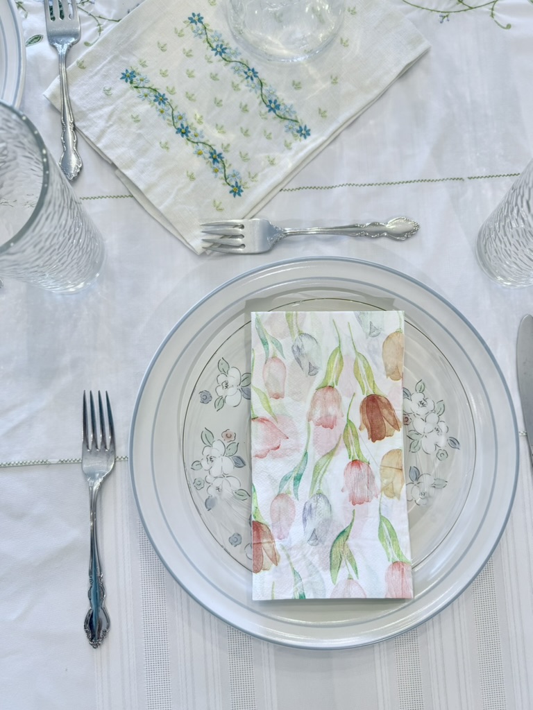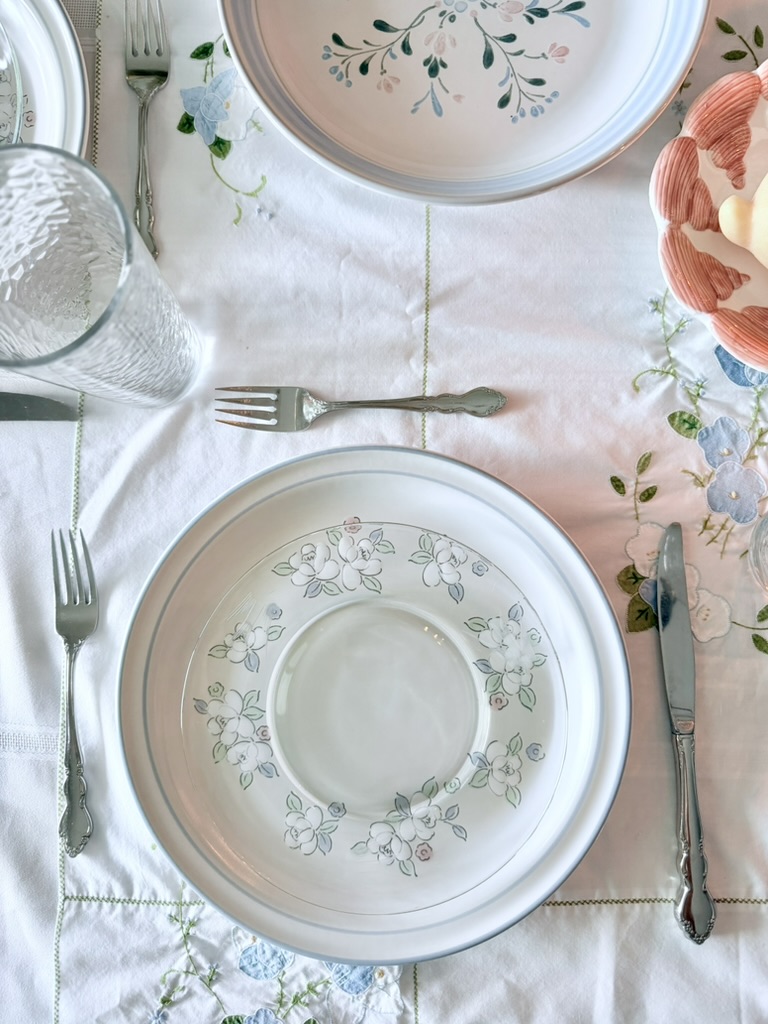 The embroidered tablecloth is my favorite Easter tablescape feature — which is yours?