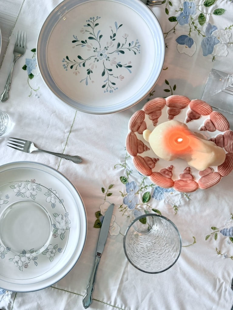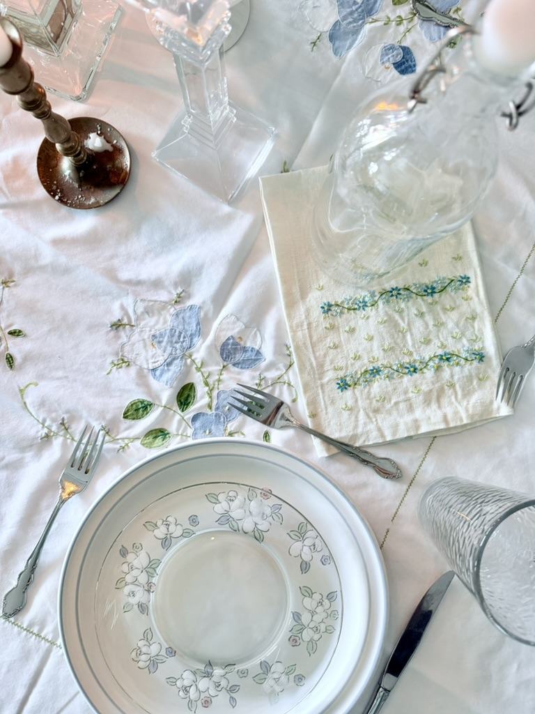 The embroidered tablecloth is my favorite Easter tablescape feature — which is yours?