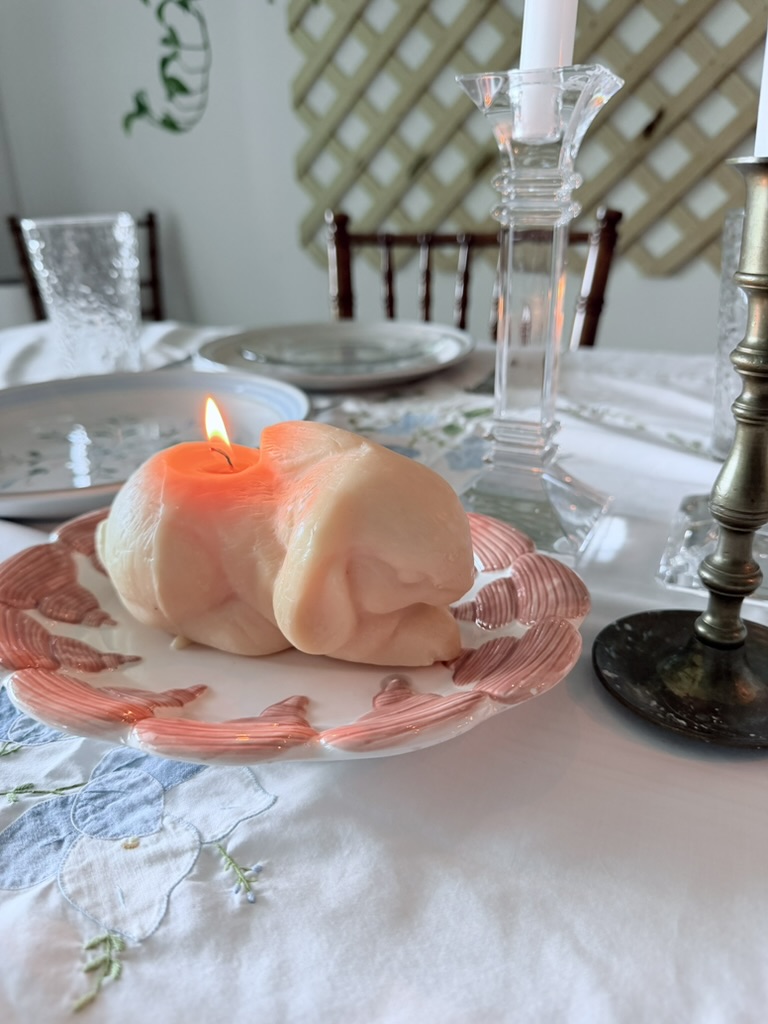 All of my candlestick holders are secondhand, and I used my recently found Fitz & Floyd shell plate (Goodwill) as a bunny candle holder.