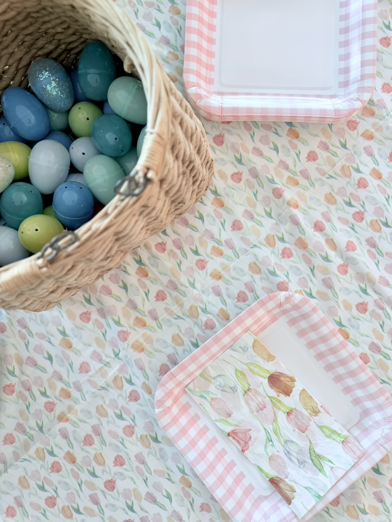 I snagged a tulip print tablecloth, matching paper napkins, and paper plates with a pink gingham pattern for the kiddos.