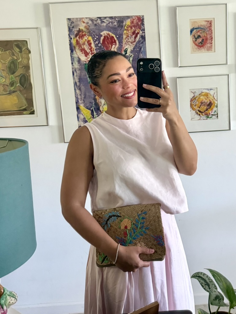 Linen Set from City Girl Consignment, Bag from Stone Button Studio